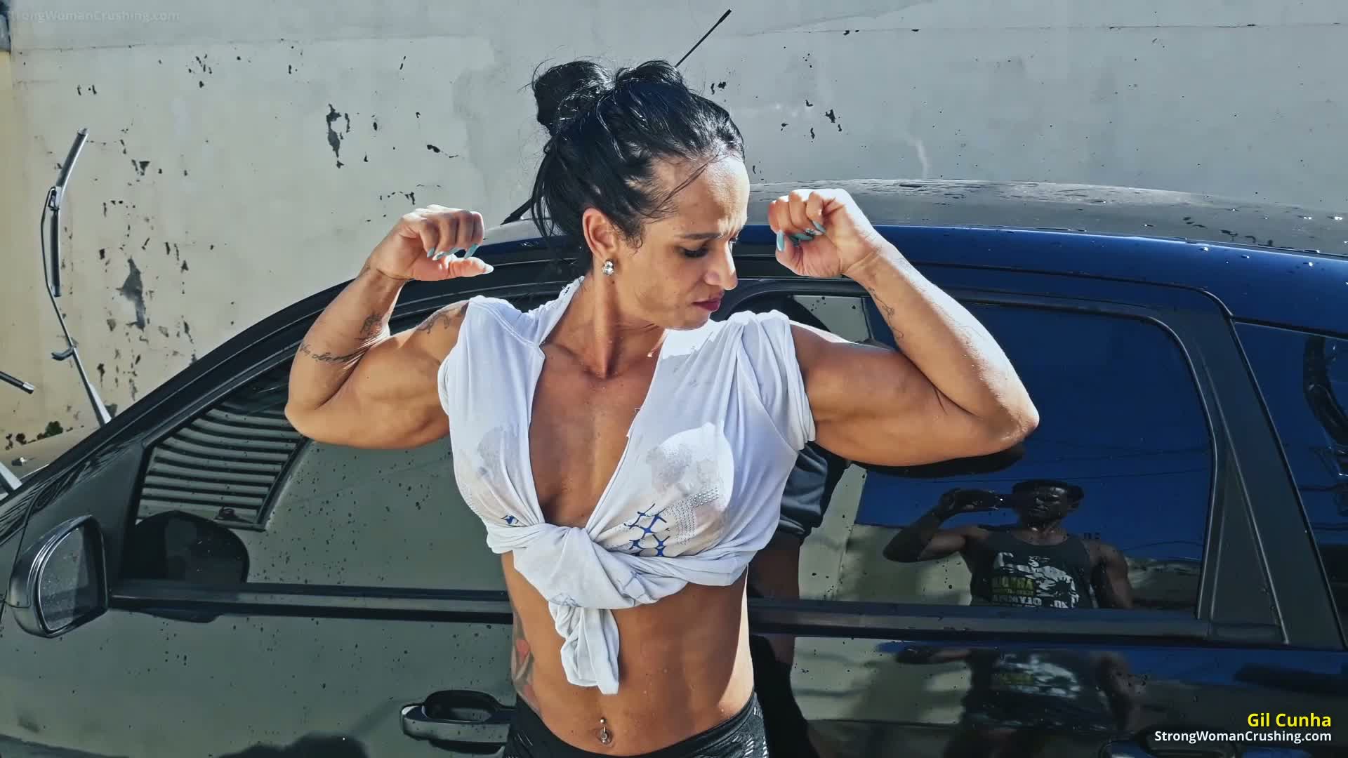 Incredible strength. Huge muscles and just a picture of beauty. Metal just folds between her hands