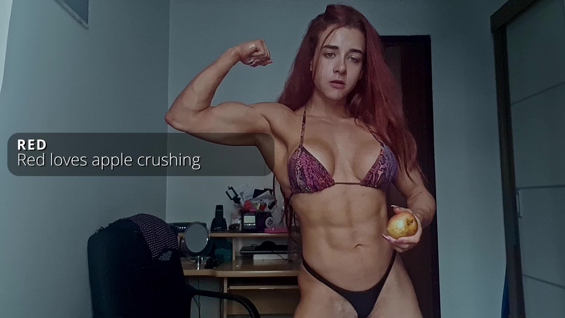 Muscular Red crushes apples passionately captivating viewers with her incredible strength and mesmerizing physique.