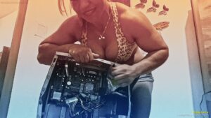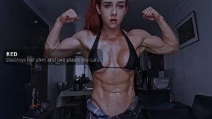 RED shows her muscle and strength by destroying some computer power supply, bending and trashing all that metal and electronics with her bare hands.