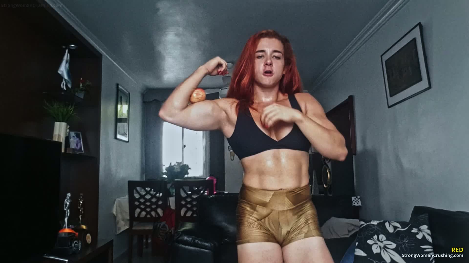 Watch Red unleash her incredible strength in this Crazycam Nurse Style video for fans of muscular women.