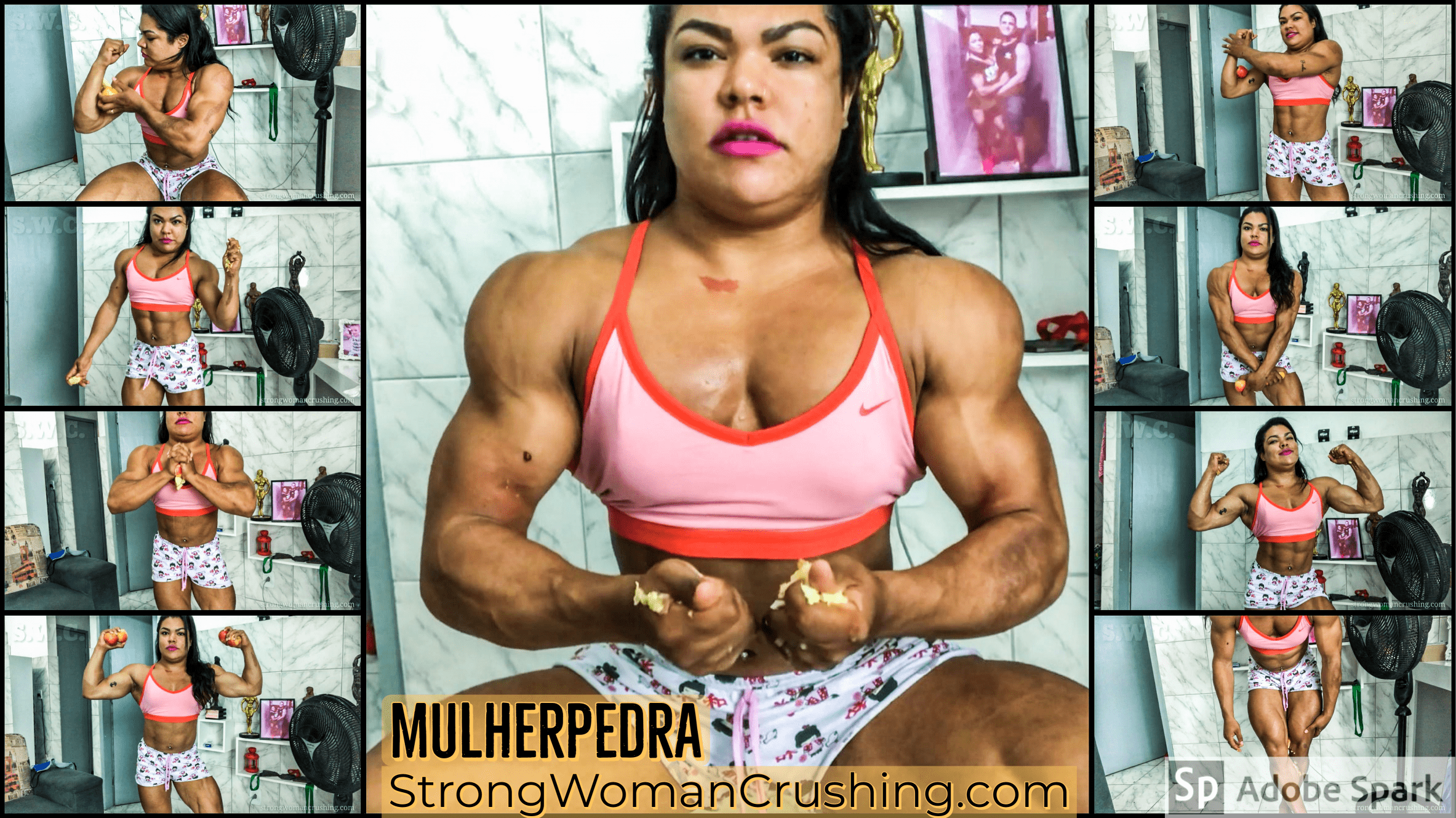 mulherpedraMulherpedra uses her solid muscles to squish some apples. She is simply too strong. She does not even use her full strength to crush those apples between her hands. She crushed an apple using her powerful legs too.