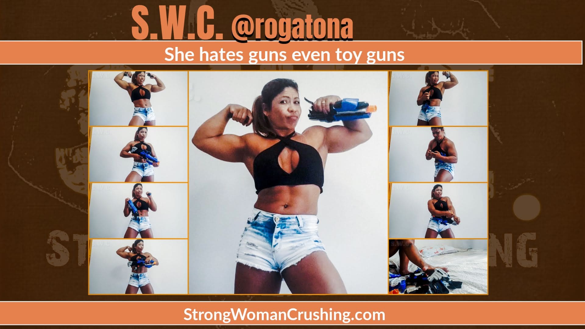 rogatonaRogatona in this video poses her big and strong muscles by flexing in several ways. She has a toy gun in her hand, she toys with it. Showing how small that toy gun compares nothing against those muscles. She starts to rip the toy piece by piece you could see the little effort she does. It is not a cheap toy, it was made to survive several waves of abuse, but that is not enough. She rips the grip of and she tears it into pieces. She pleasures destroying that toy gun. Nothing stands in her way.