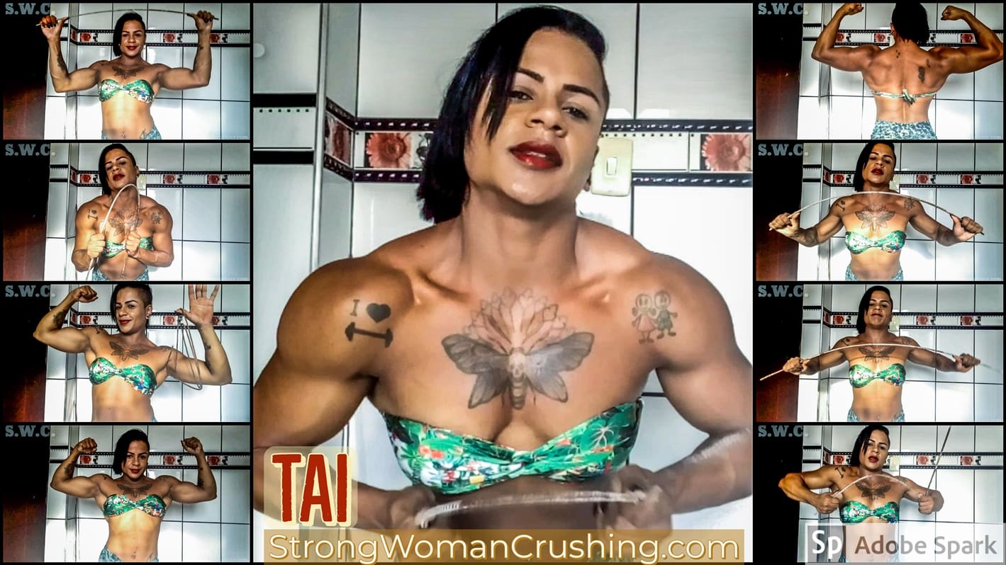TaiTai, always impresses us with her strength. Now she took some metal bars for the bar bending session. She is using a nice bikini outfit which shows her muscular body while she flexes and does some bending show. All bars are bent by our muscled girl. None scaped...