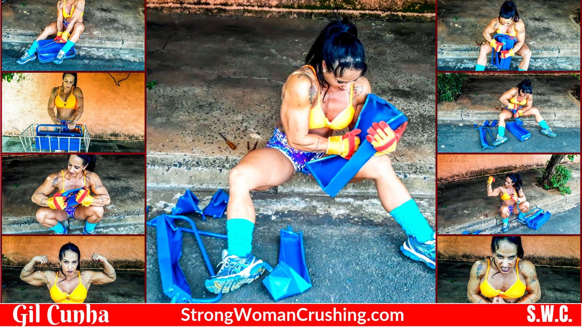 GilcunhaGil Cunha has those big muscles and those are not for display only. She picks one of the biggest metal toolboxes we have seen till now. It is new and shining. Someone locked with some metal bar. That is is not enough she rips that bar of the metal box and starts to bend and trashing it. It is possible to see the metal trying to resist her incredible strength but she is far stronger than it. She destroys it. You can see her satisfaction I m the end.