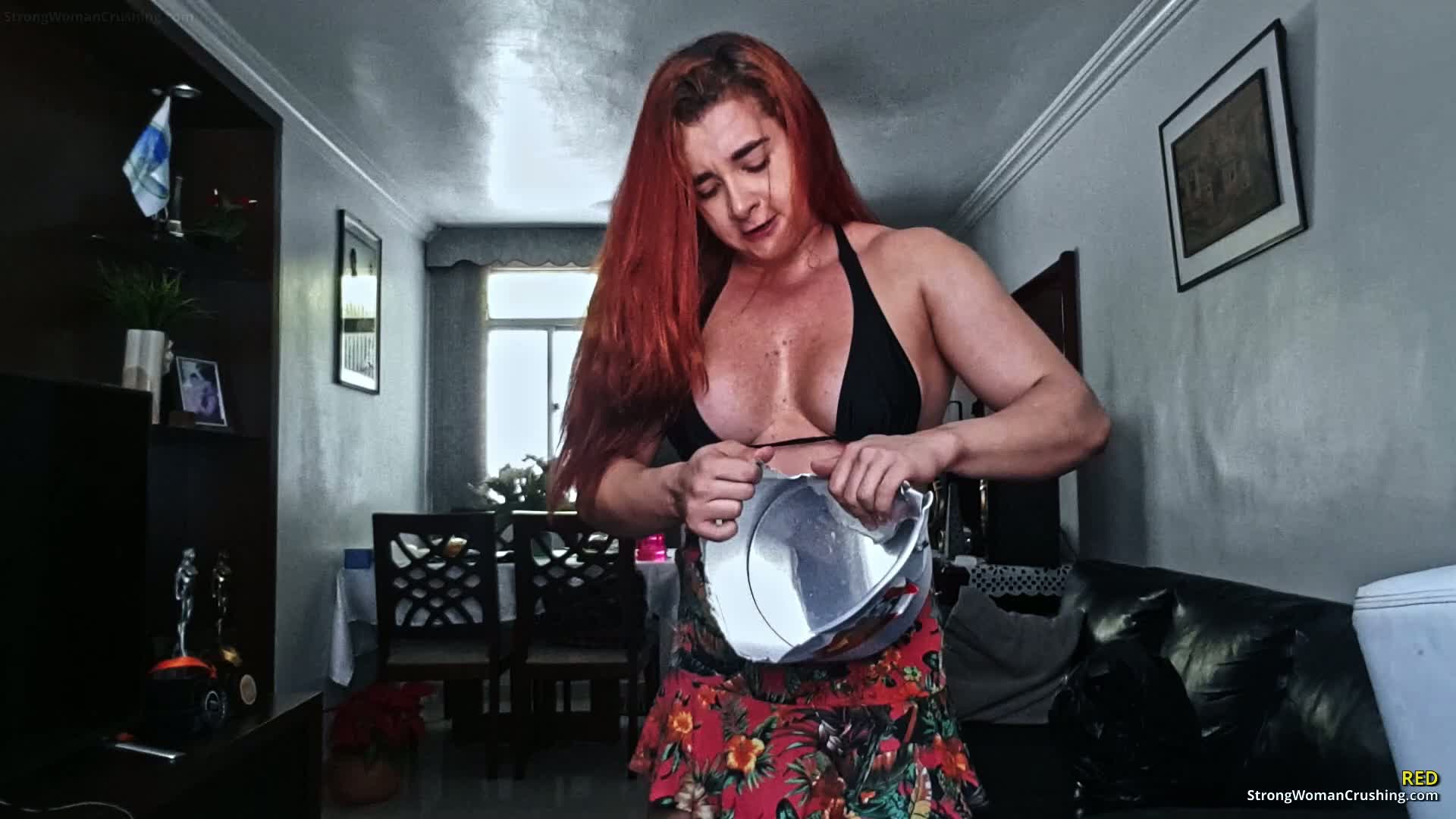 Watch Red Pan showcase her incredible strength as she effortlessly rips apart a large metal pan. Model: Red.