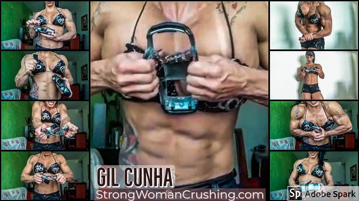 GilcunhaGil Cunha picks a metal toy car for a fun demonstration of her immense strength. She received some very sturdy 1/24 metal toy cars. Incredible how much destruction Gil can make. She can bend and rip the metal body using her muscular arms and pecs, total and complete destruction.