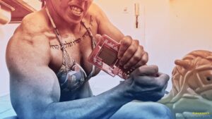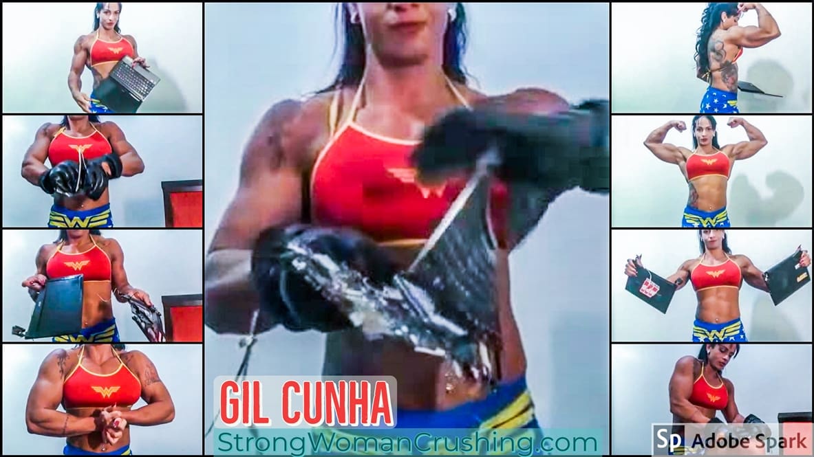 GilcunhaGil Cunha flexes her immense arms and, with her mighty biceps and pecs, destroys an entire netbook resting only pieces smashed behind her sensual muscles.