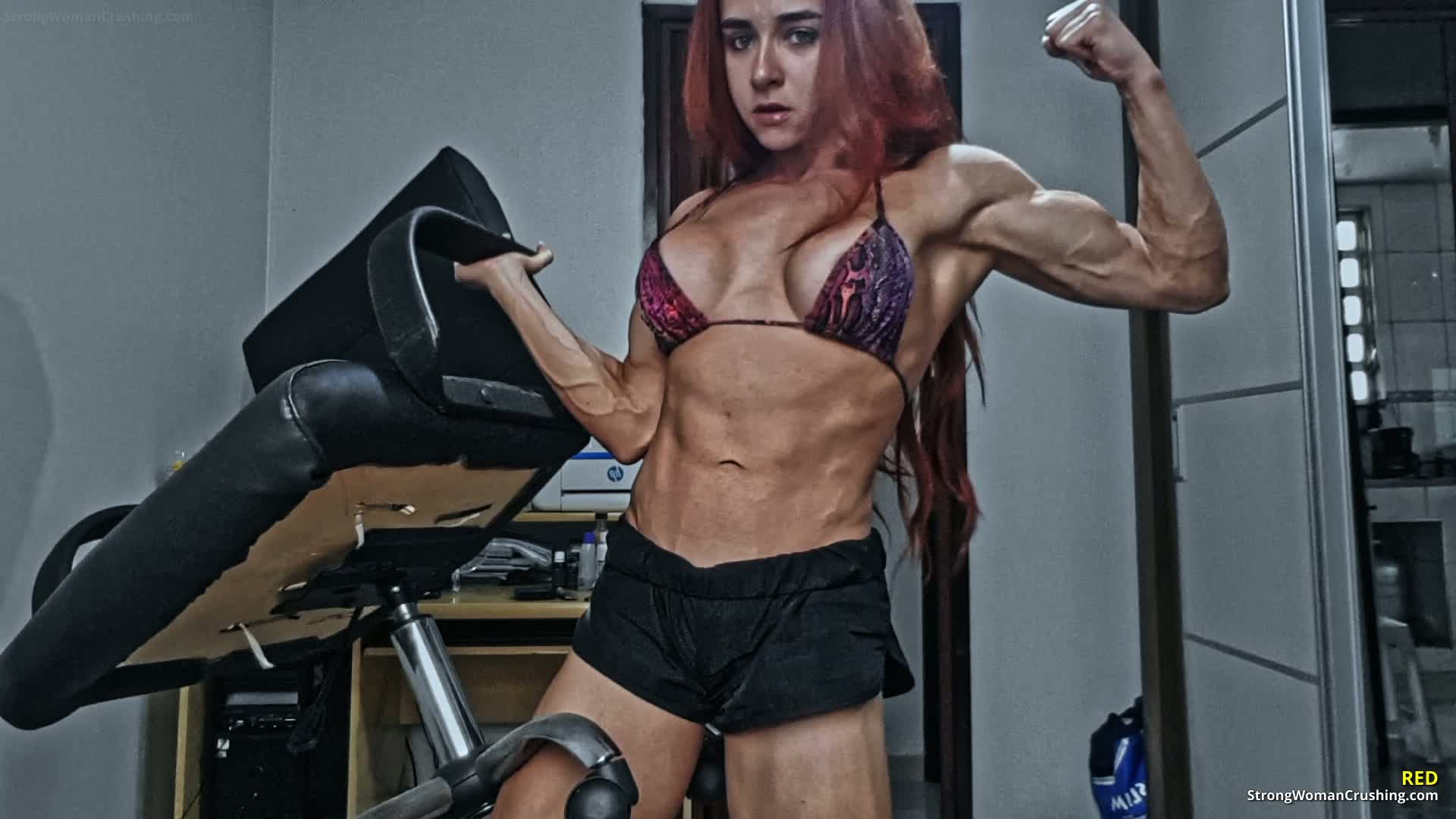 Red, a muscular woman, lifts her heavy office chair with ease. A must-watch for fans of strong female athletes!