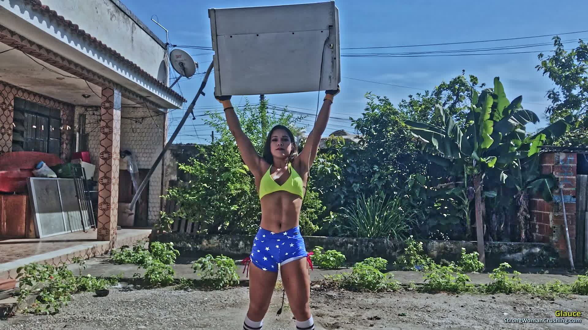 Glauce shows her incredibly muscular physique and power. In this video by posing while she lifts and destroys a washing machine by punching and ripping it apart.