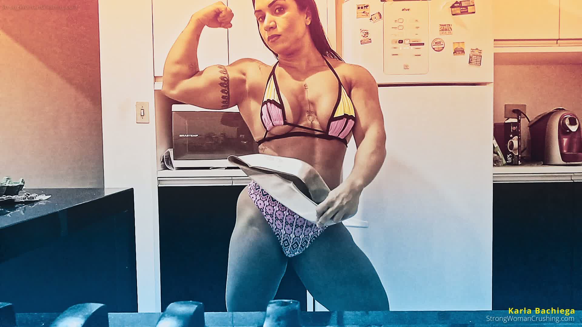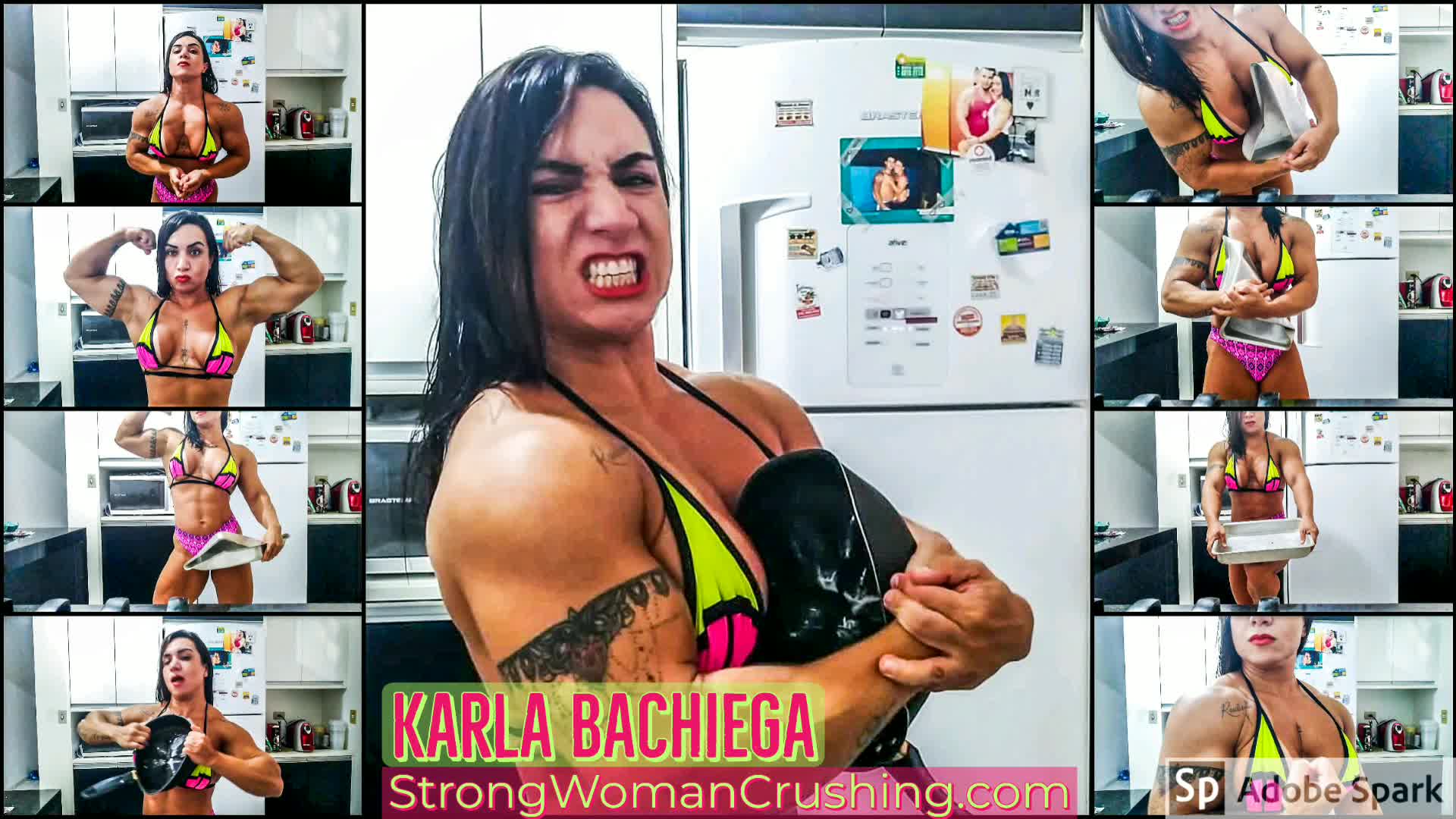 karlaWatch Karla incredible feat of strength as she bends two pans with her muscular arms and pecs. This amazing display of power will have you in awe!