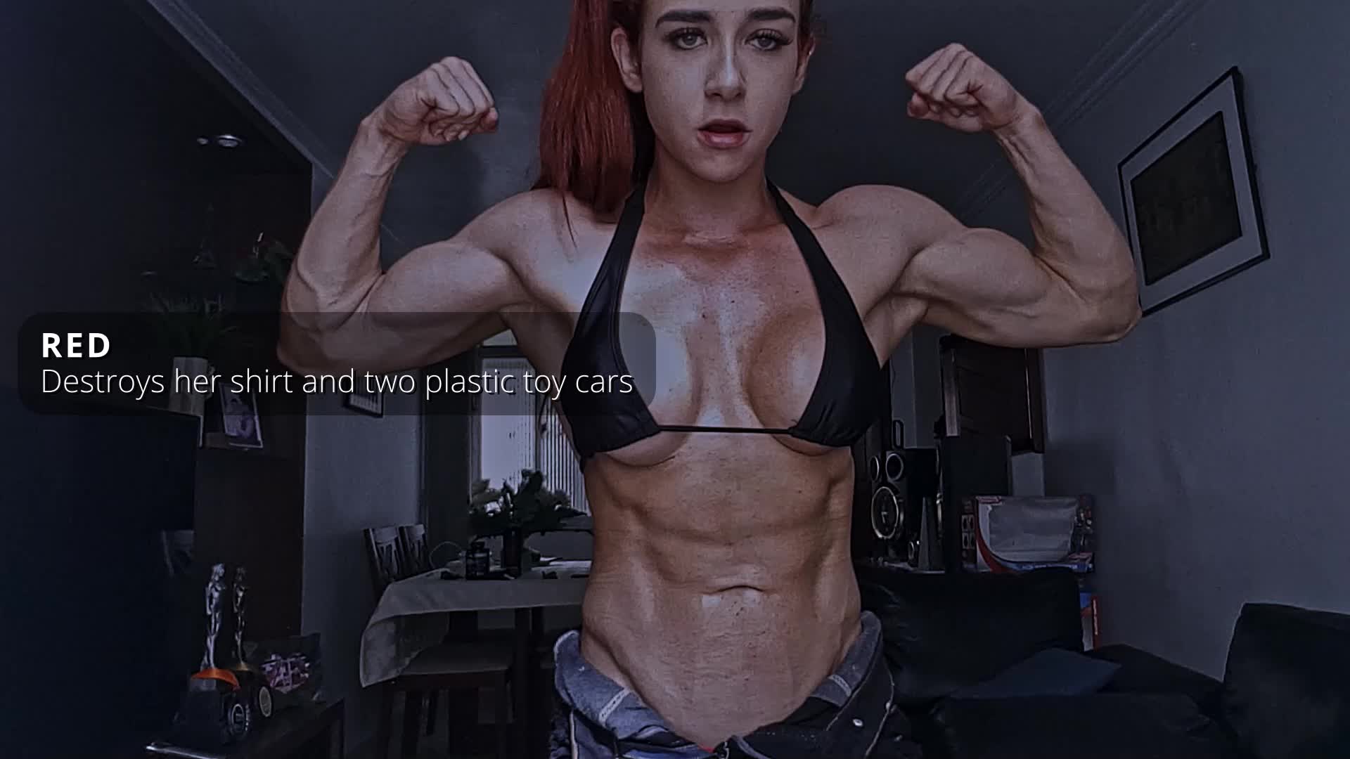 RedWatch Red a muscular woman unleash her power as she destroys her shirt and two toy cars. Incredible strength on display.