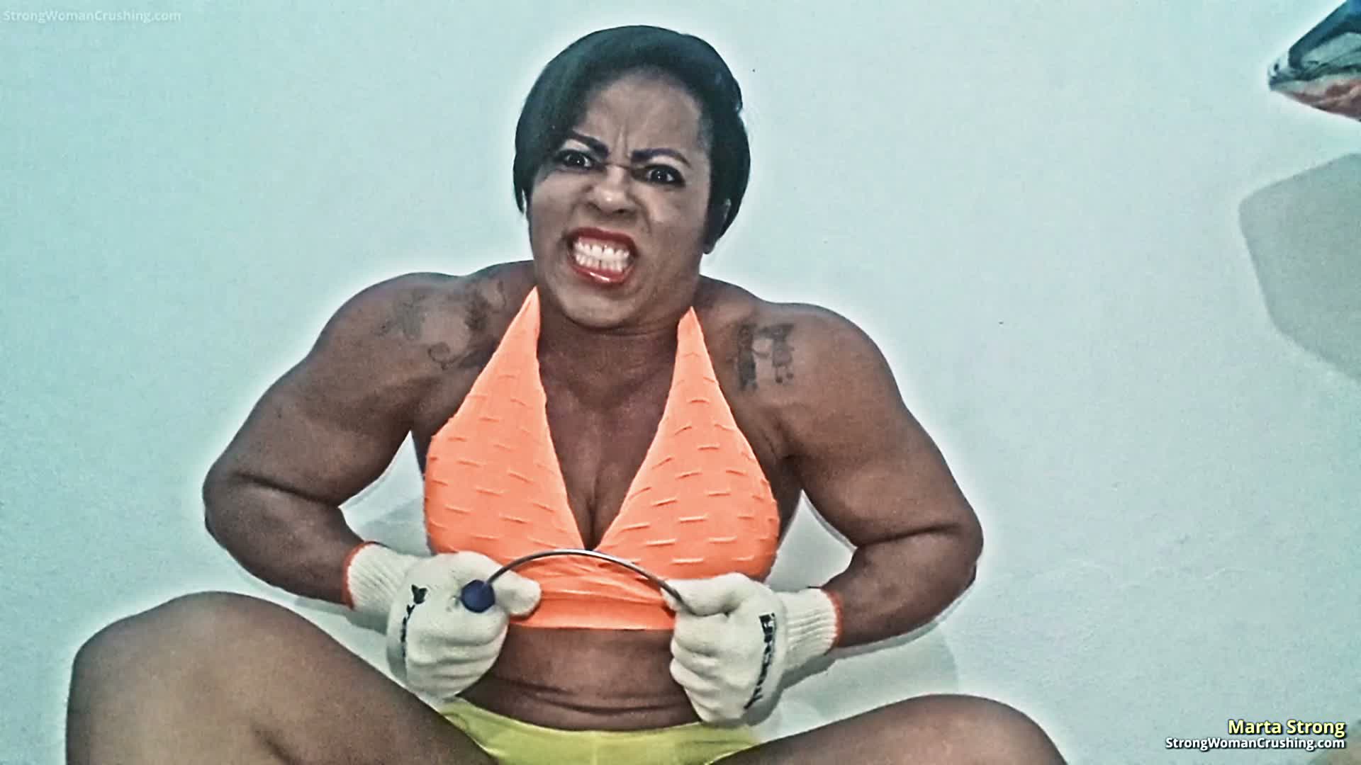 Marta Strong has strength in her name for nothing. In this video, she takes the screwdriver challenger up a level above all. She used two thick and reinforced screwdrivers, those made of reinforced metal to withstand pressure and torque. Well, they met Marta SUPER Strong. She picks the first one does bend it, even breaking it into two parts. It is possible to see how much strength she has to put to bend and break it. In the second one, she twists with her hands and uses her knees for some more pressure, well broken again. She flexes her big and bulged arms in an impressive victory pose.