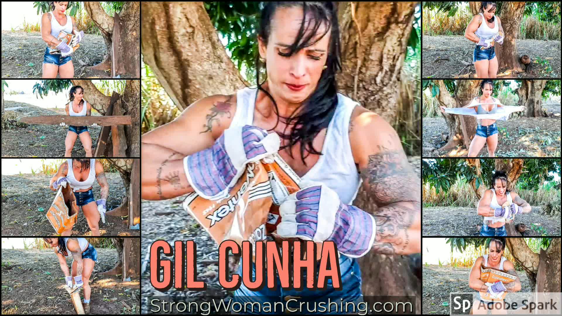 GilcunhaGil Cunha, flex her muscles in the woods. She picks, bends, and destroys some things that are laying around. Some big, sturdy paint cans, she picks and bends those using her arms also bear hug them against her muscular pecs, they also got stomped by those muscular legs power. Some drawers got destroyed too, ripped apart by our goddess of destruction.