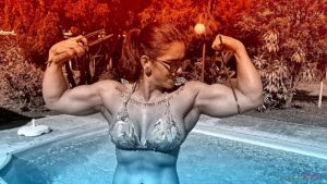 Venus crushes apples with her muscular arms