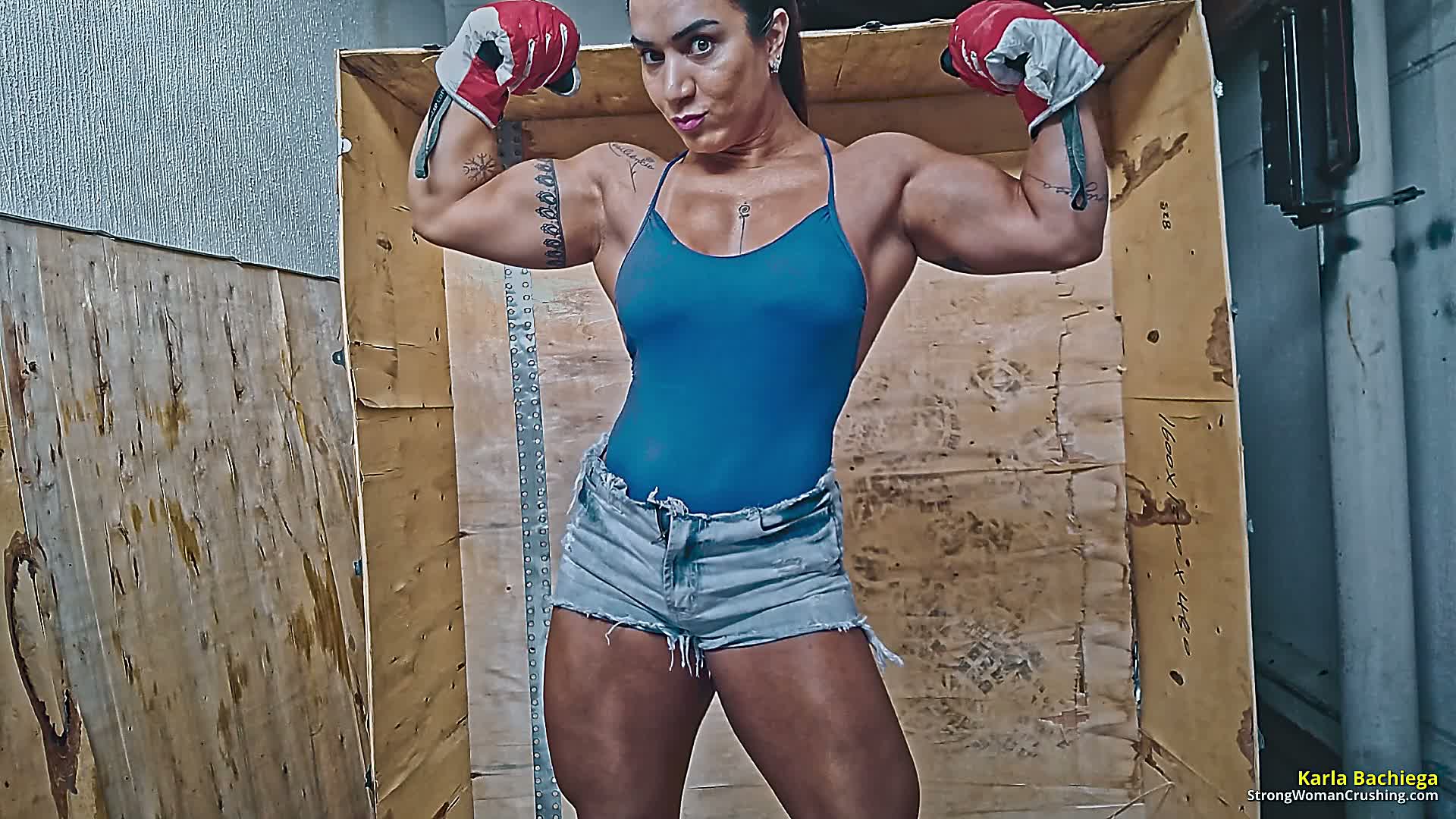 Karla, she is a perfect Amazon. Beautiful, muscular, strong and loves to show her strength. She wanted something big to destroy, so we arranged a big piece of furniture to be destroyed. She broke all those wooden parts some metal parts were reinforcing it but those bent as they re nothing. She is bigger and better.