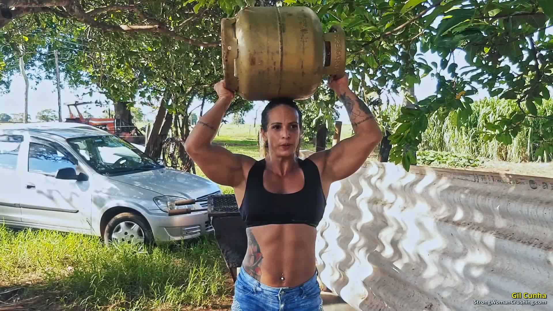 Gilcunha: Muscular woman works out with gas cylinder for a dynamic routine.