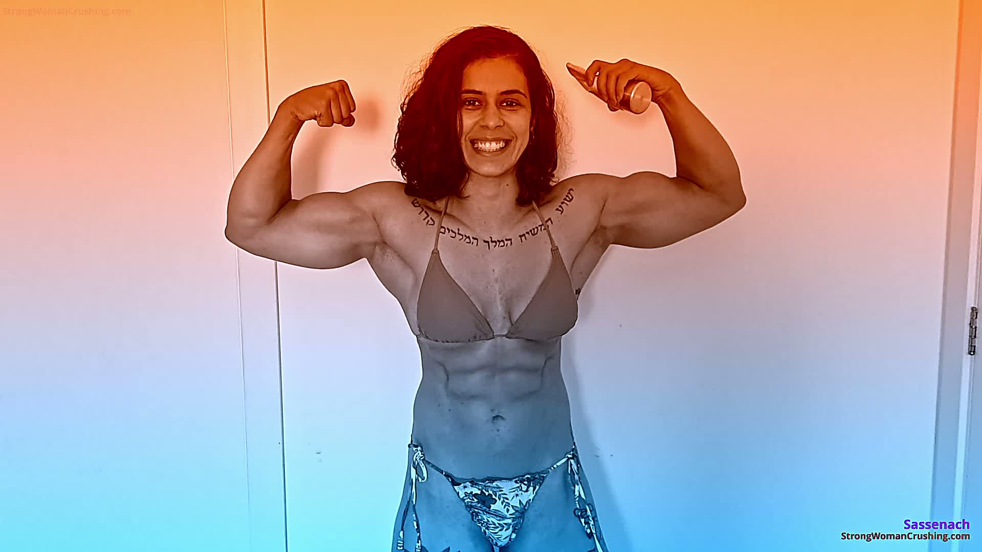 SassenachWatch Sassenach a powerful female bodybuilder effortlessly crush metal and rip her shirt in this intense video.