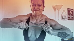 SassenachSassenach, a muscular woman, crushes an empty big can. A must-watch for viewers who love strong women.