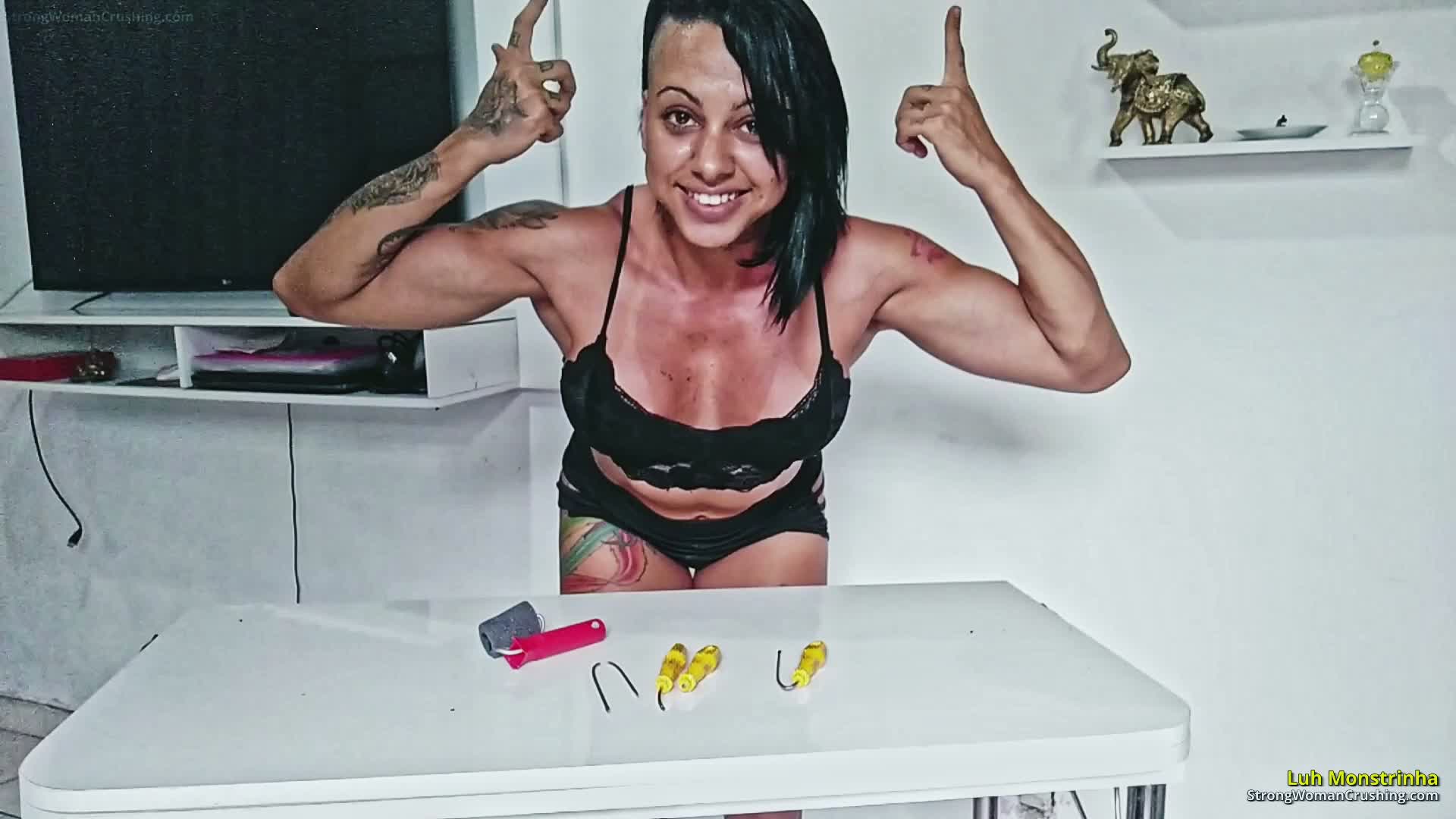 Luh Monstrinha, her strength is up to par with her beauty. She is ready for another test. She flexes her strong and dense muscles showing how strong those arms, backs, and pecs are. She picks the first screwdriver and using her iron pecs and arms she bends it, easily. There is no challenge at all, pumped after the first one, she bends the second one, shows how her muscular pecs works while the metal is bent. She is unstoppable, goes for the third screwdriver, and another one is bent easily. Luh using her strong arms she snaps the second screwdriver, a snap sound is heard. With such strength and power, she snaps another one for fun, and for making it complete she snaps the last one. When you think all is over, she picks a small metal roller that is there and bends it out of shape. A lot of metal bends in this video, her grunting and sweaty body screams strength.