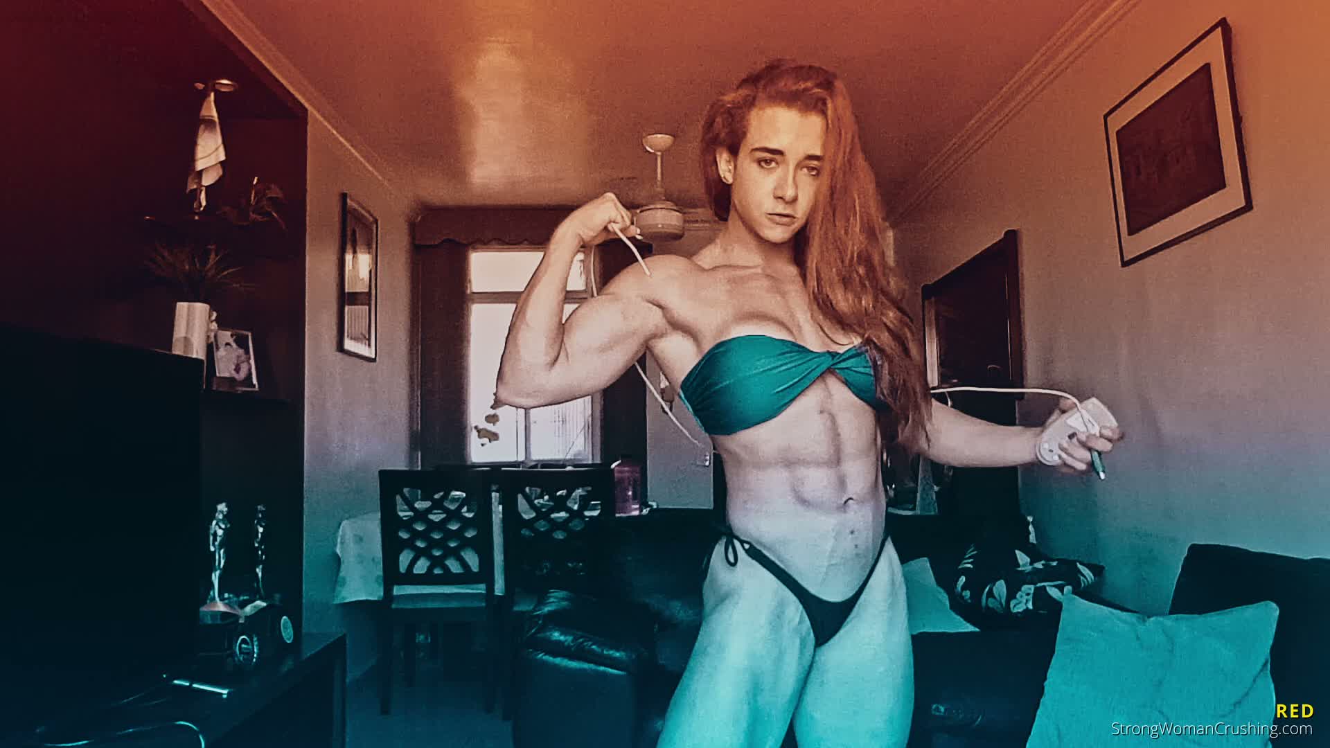 RedRED, she loves to use her strength for destruction. In this video, she starts flexing her shredded muscles. Abs, legs, pecs, and biceps are shredded in muscularity. She destroys two PC speakers as her stress relief object tearing apart without any remorse.