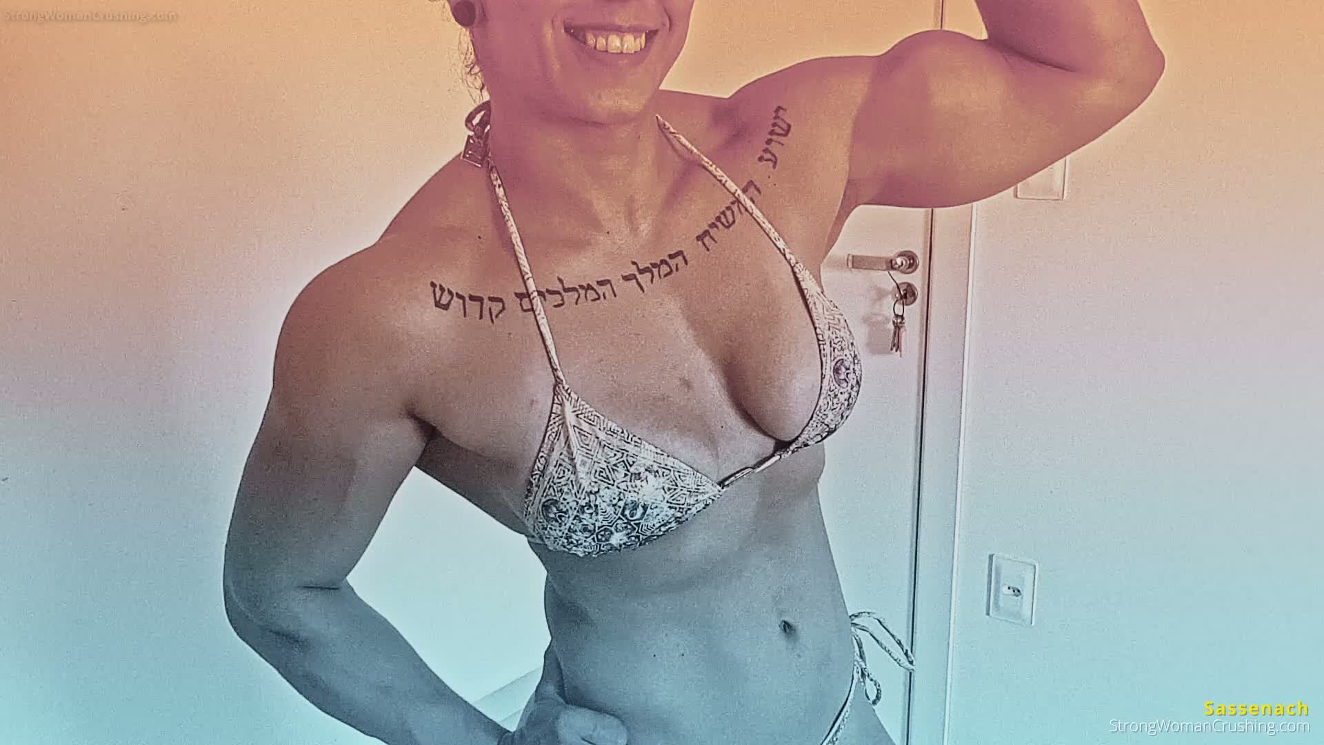 SassenachSassenach is a muscular woman who destroys a spraycan to get her muscles pumped. For viewers who love muscular women.