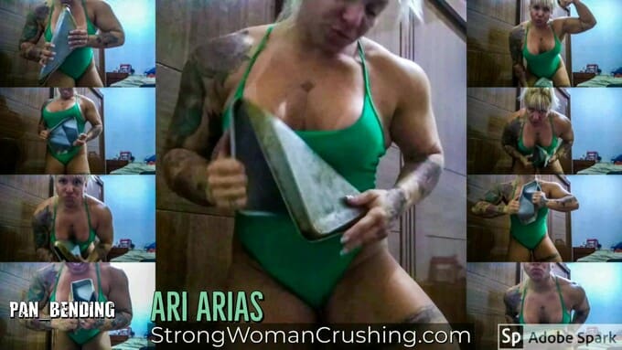 ariariasWatch Ari Arias a big muscular woman crush a pan in this powerful video. #musclewomen #strength #ariarias