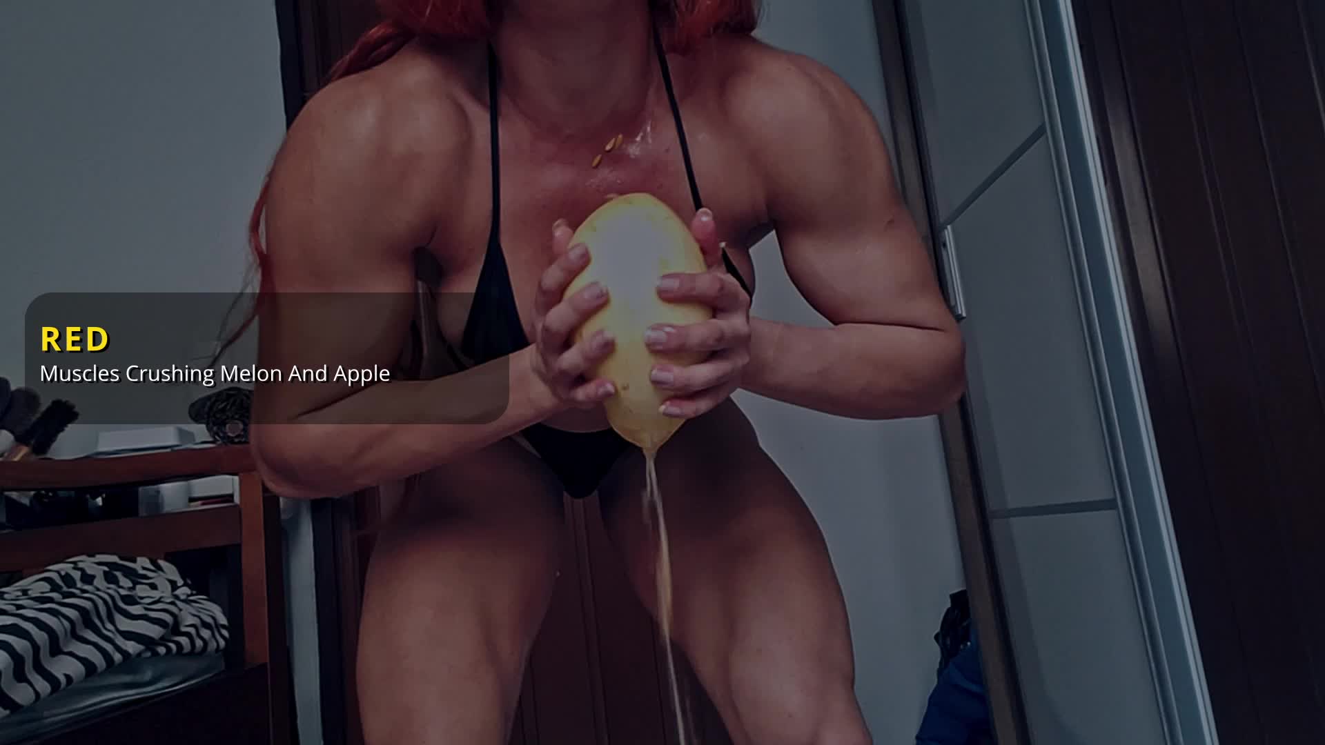 RedRED, her muscles still impressive as always. She uses her absurd strong and muscular body for some fruit-crushing action. She takes some apples and her pecs explode while she puts its strength on those apples. She smashes those apples because she enjoys being messy and smashes things with her might. She proceeds to a melon, no challenge... It explodes between her legs and arms. She can destroy your head between her hands or legs if she does want.