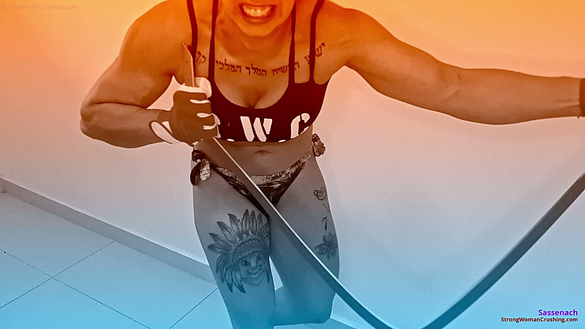 SassenachSassenach, a muscular woman, bends a big steel piece for fun in this video. Enjoy watching her strength and power!