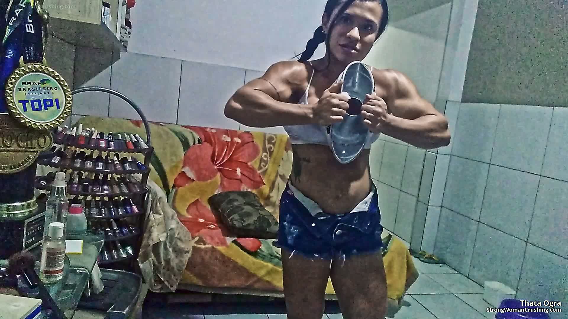 Thata Ogra loves being strong and muscular. In this video, she poses her incredible muscular body showing how much dense they are. For her strength, she smashes a metal pan with her bare hands while she enjoys it.