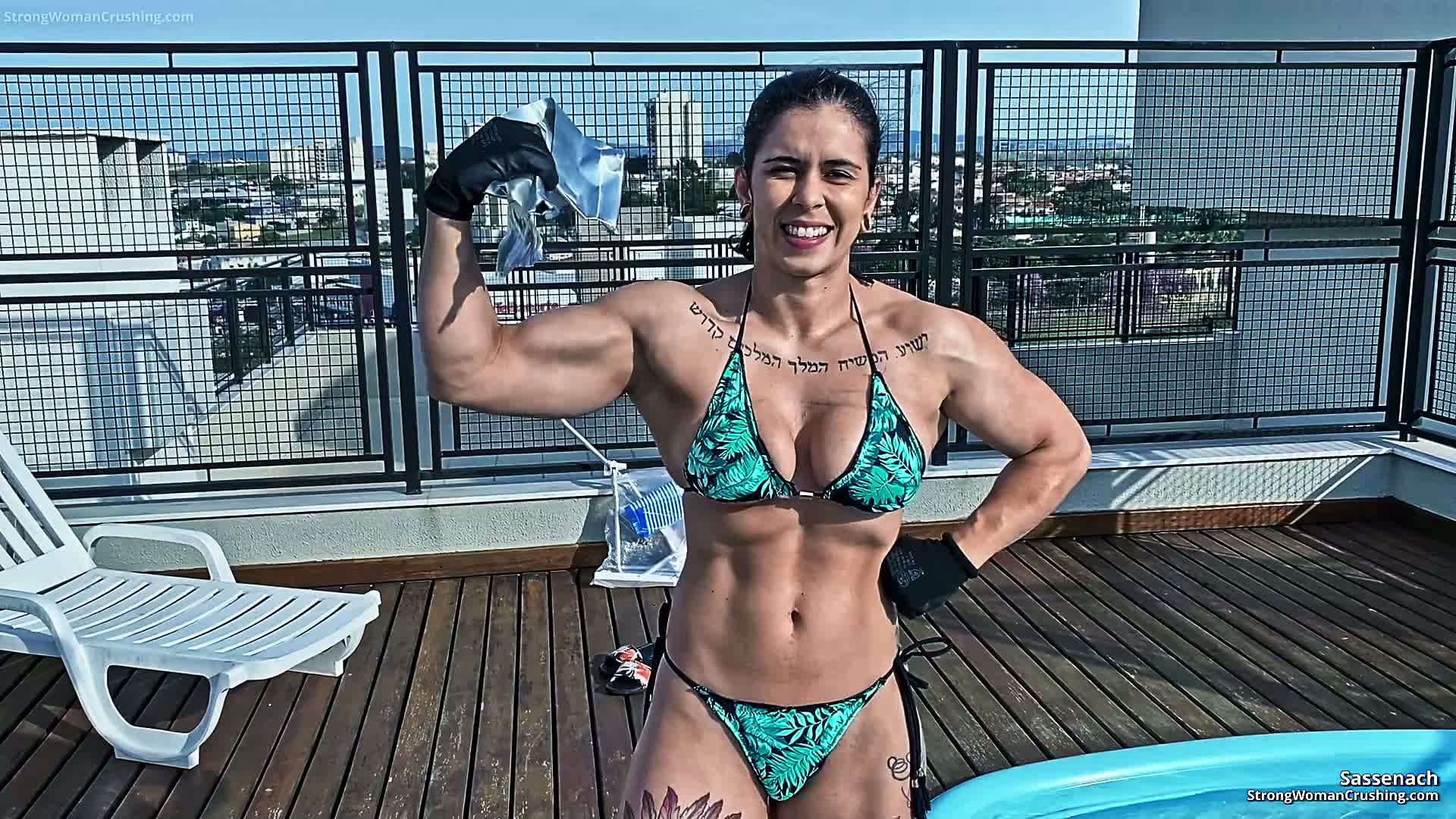 Sassenach, the strong and muscular woman, shows off her biceps as she crushes a metal bucket with ease! Watch to be amazed!