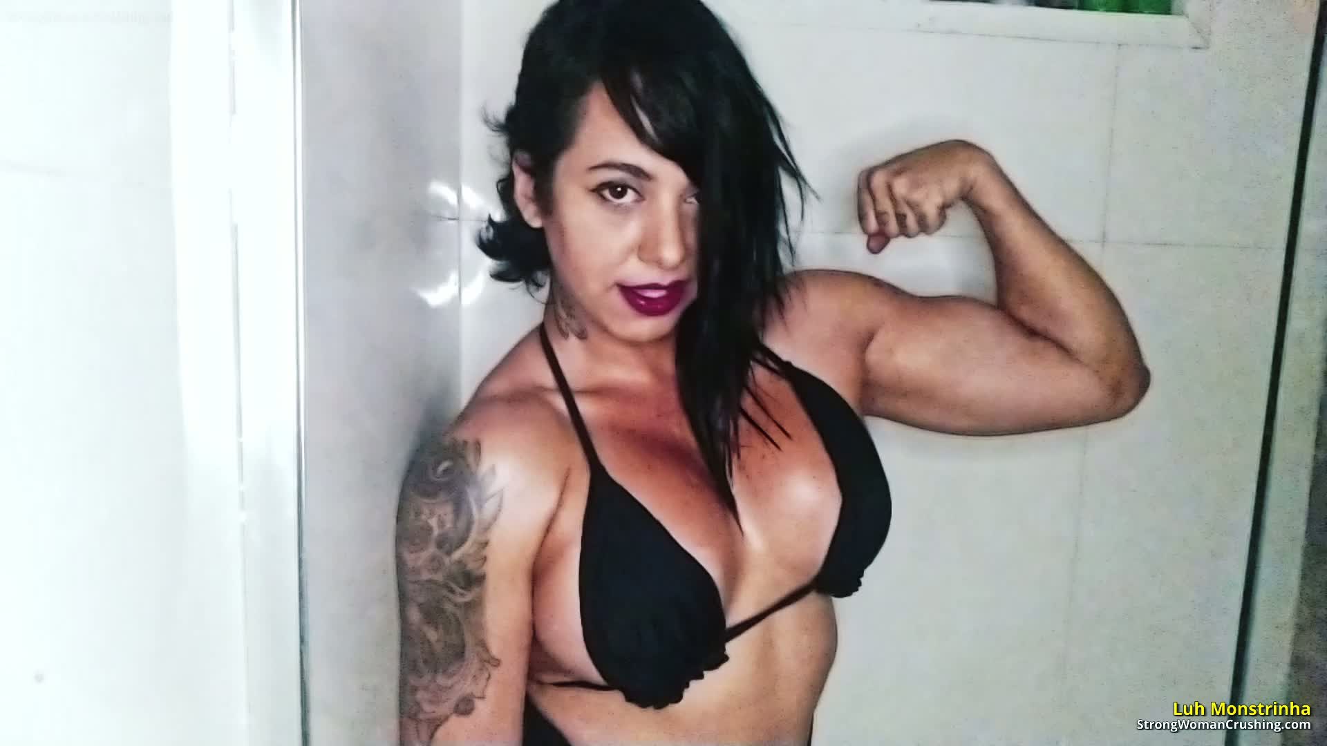 Luh Monstrinha shows her powerful and strong pecs. She flexes her muscles exhibiting how strong she is. She picks a soda can using all her strength she smashes…