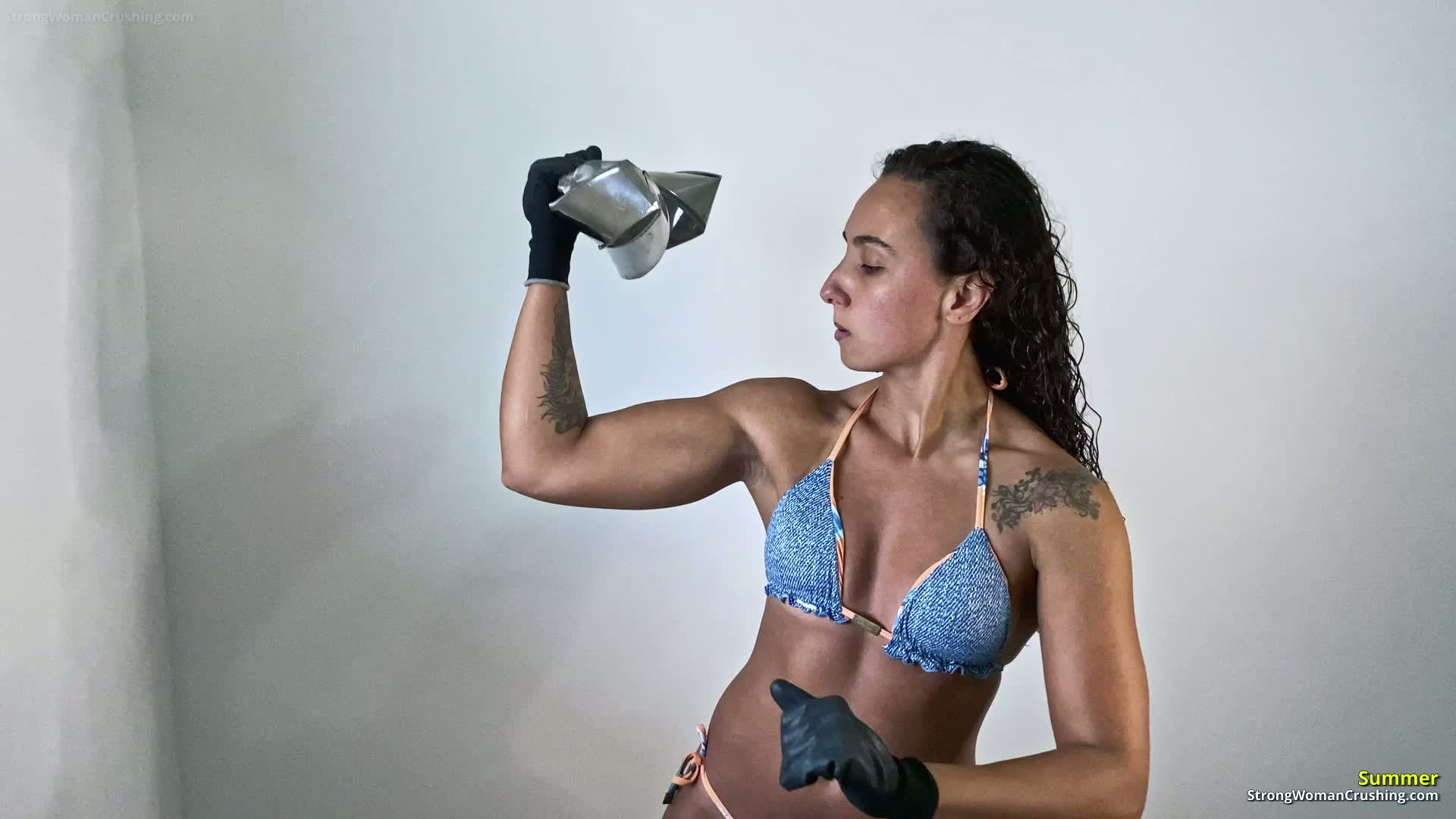 Muscular woman Summer showcases her strength bending metal in this captivating video.