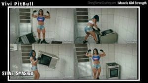 viviVivi Pit Bull, she is pure strength and power. Watch how she flexes her dense muscles. You could fill her power and strength. She picks some apples and crushes it as it were nothing resting. Female muscle crushing machine.