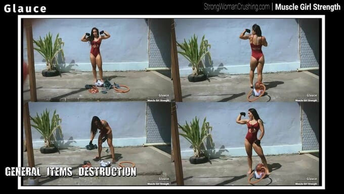 GlauceGlauce smashes and crushes a vacuum clear. She flexes her dense and strong muscles, her biceps bulges over her arms. Glauce picks an old big vacuum cleaner using her full power, strength dismantles and destroys everything. Watch her super strength in action.