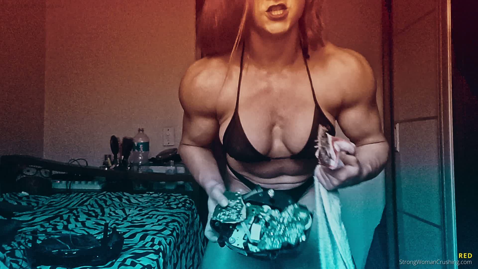 RedRED using her super-strength demolishes a boombox. Watch RED flexing her strong and hardened muscles her pecs and biceps explode with her power. She picks the boombox and starts to rip it apart with her sheer strength leaving nothing behind.