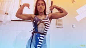 Glauce, the muscular woman, shows off her toned figure in a black bikini. She flexes and displays her strength in this video for viewers who love muscular women.
