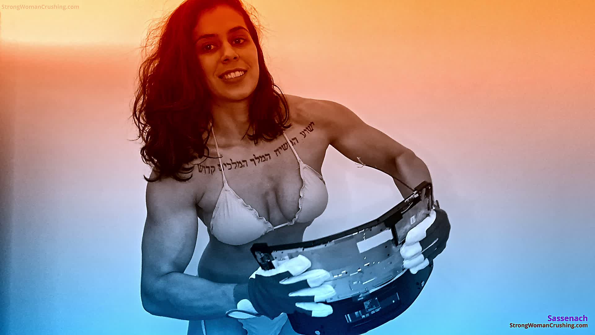 SassenachSassenach, continues her rage and destruction in this video. Watch the beginning here. She flexes those big bulge arms and pumps, even more, her biceps. Her strength is absurd, ruining the entire notebook and destroying every part with her hands.