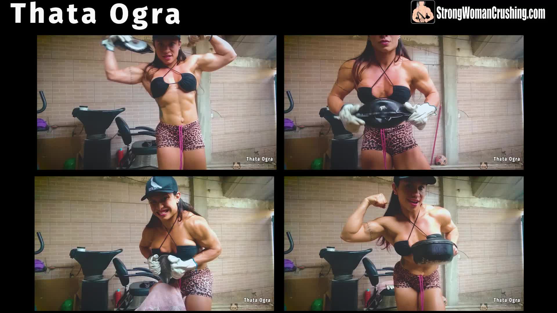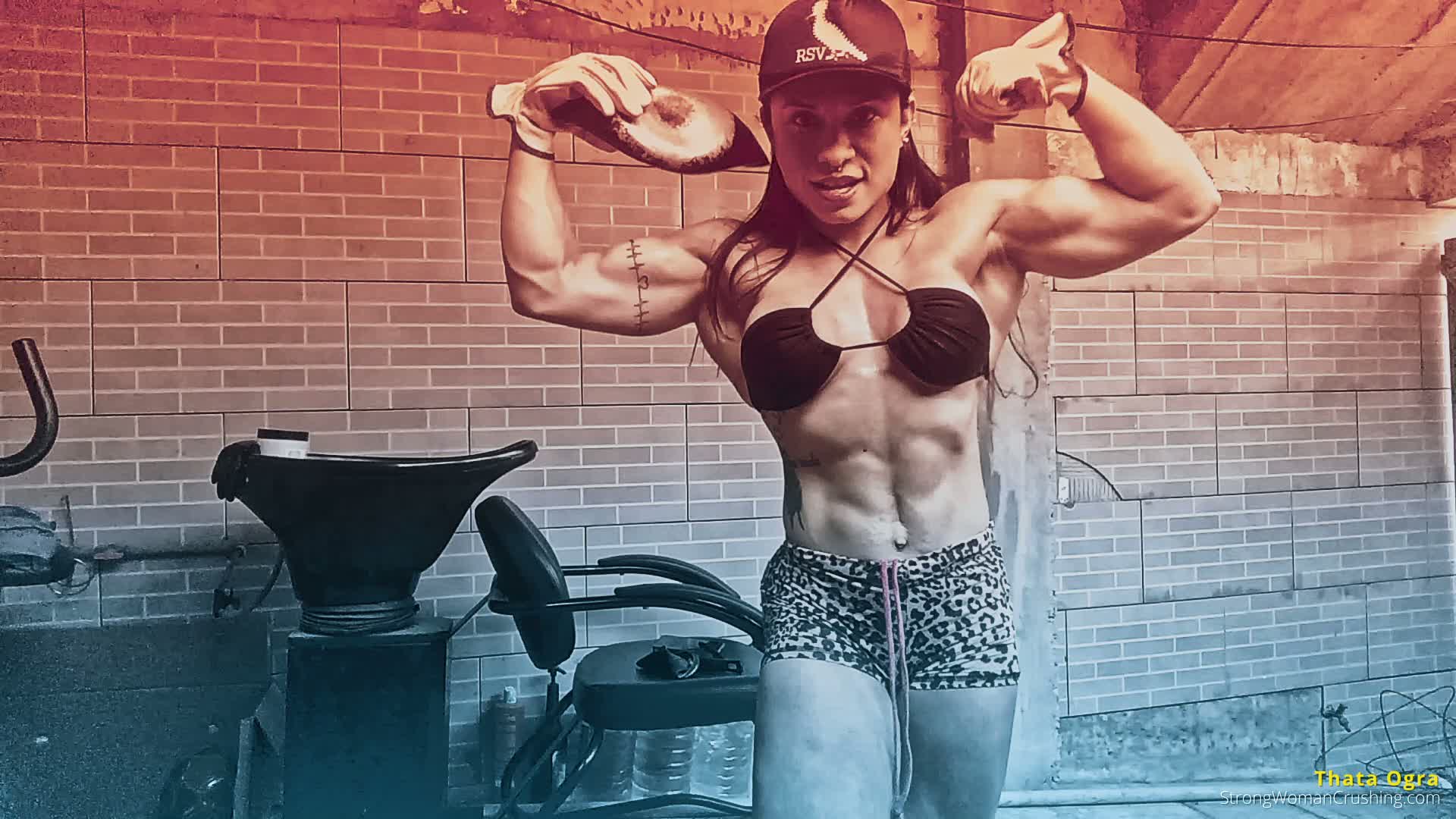 thataograThata Ogra, super muscular and destructive she flexes her absurd and powerful body exhibit those incredible and shredded muscular arms, legs, and pecs. She picks a reinforced metal pan and with her pecs mighty she transforms it into a mangled metal ball.