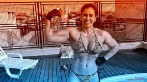 SassenachSassenach, this beautiful and powerful girl, exhibits her incredible muscular body in the sun while she does some sewing and breaks some wood with those big and might biceps. Stay ready for the next part.