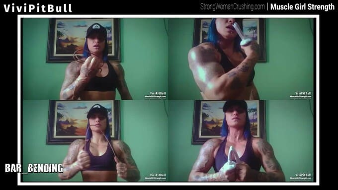 viviVivi is back, stronger than anyone. In this video, she poses her dense muscularity and using those strong arms and pecs bends a metal bar several times just for fun.