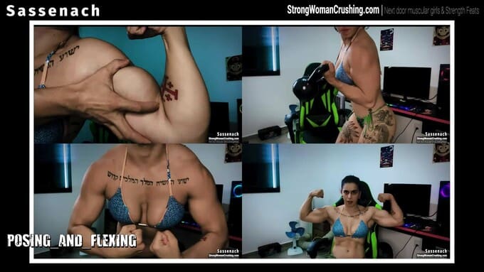 SassenachSassenach shows off her toned muscles in a blue bikini in this video, perfect for viewers who love muscular women.