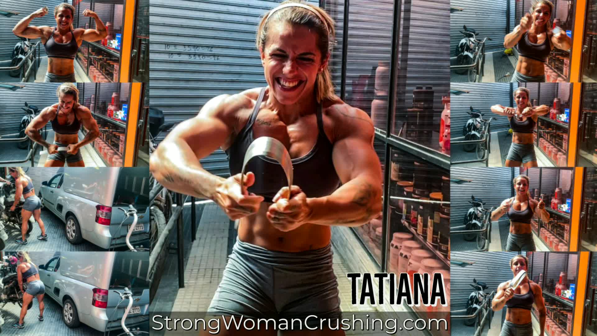 tatianaTatiana uses those big and round muscles for some strength show, she lifts a scooter effortless and bends iron support.