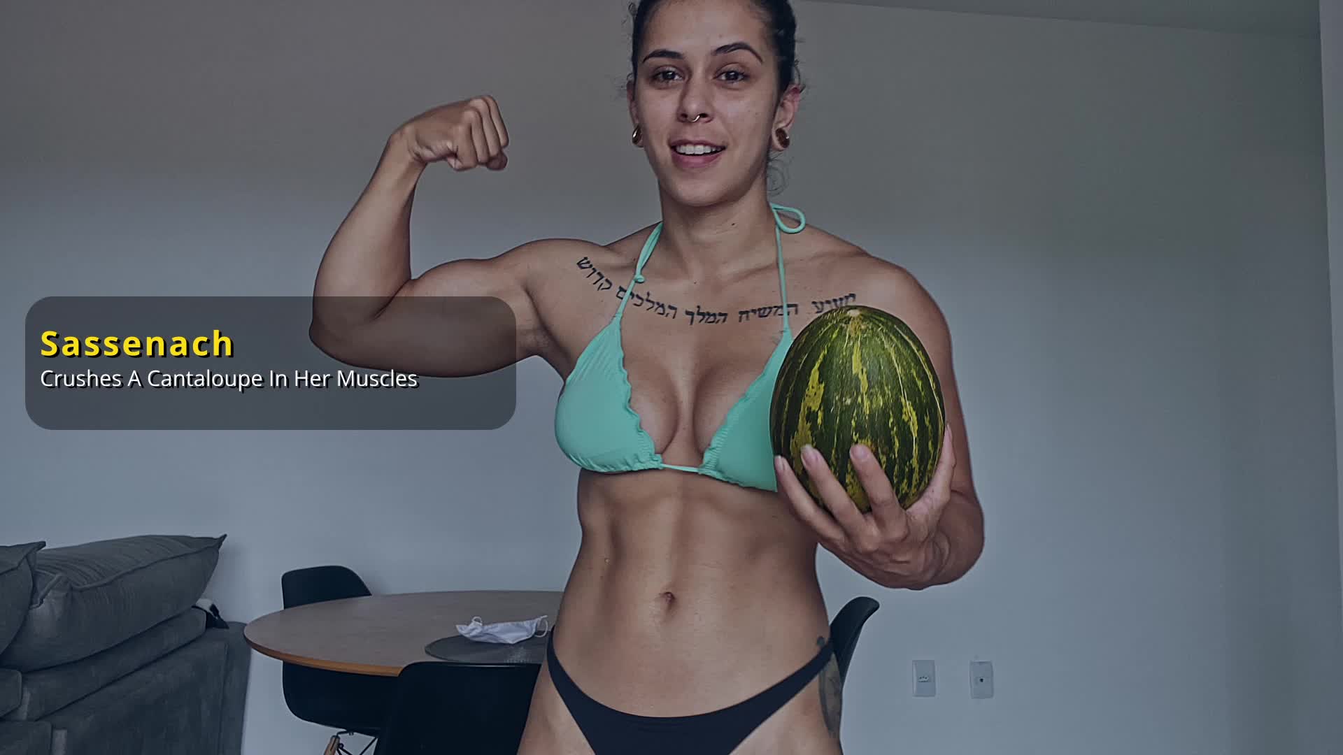 Sassenach crushes a cantaloupe in her muscles