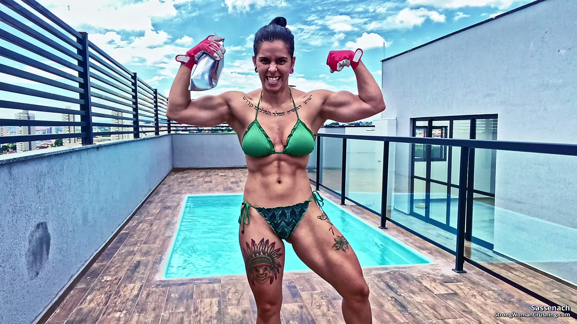 Sassenach builds her muscles for power and destruction, now using a bikini, rips and breaks apart a high-quality pan leaving her biceps and pecs pumped and impressive as always. She destroys everything with a smile on her face.