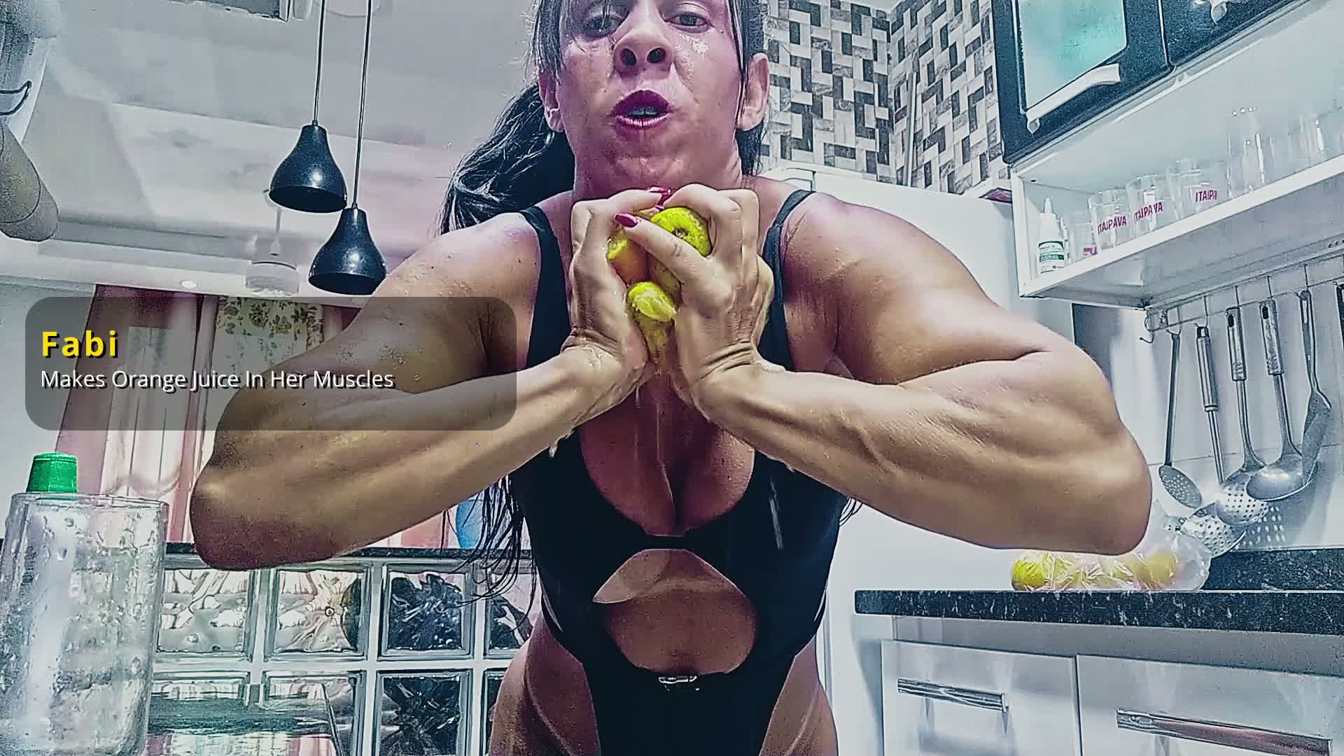 fabiFabi picks some oranges and using her muscles she makes a sexy orange juice session, crushing all those fruits using only her muscles and hands. Stay ready for some hot goddess muscle action.