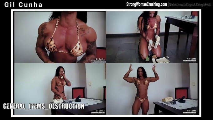 GilcunhaGil Cunha destroys an old telephone device using only her hands and powerful biceps strength.