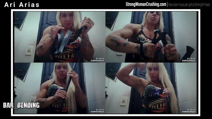 ariariasAri arias pose her dense and sensual muscles while she bends some metal with her hands. Watch this sexy muscular blonde bending and destroying a metal piece while her muscle bulges on the screen.