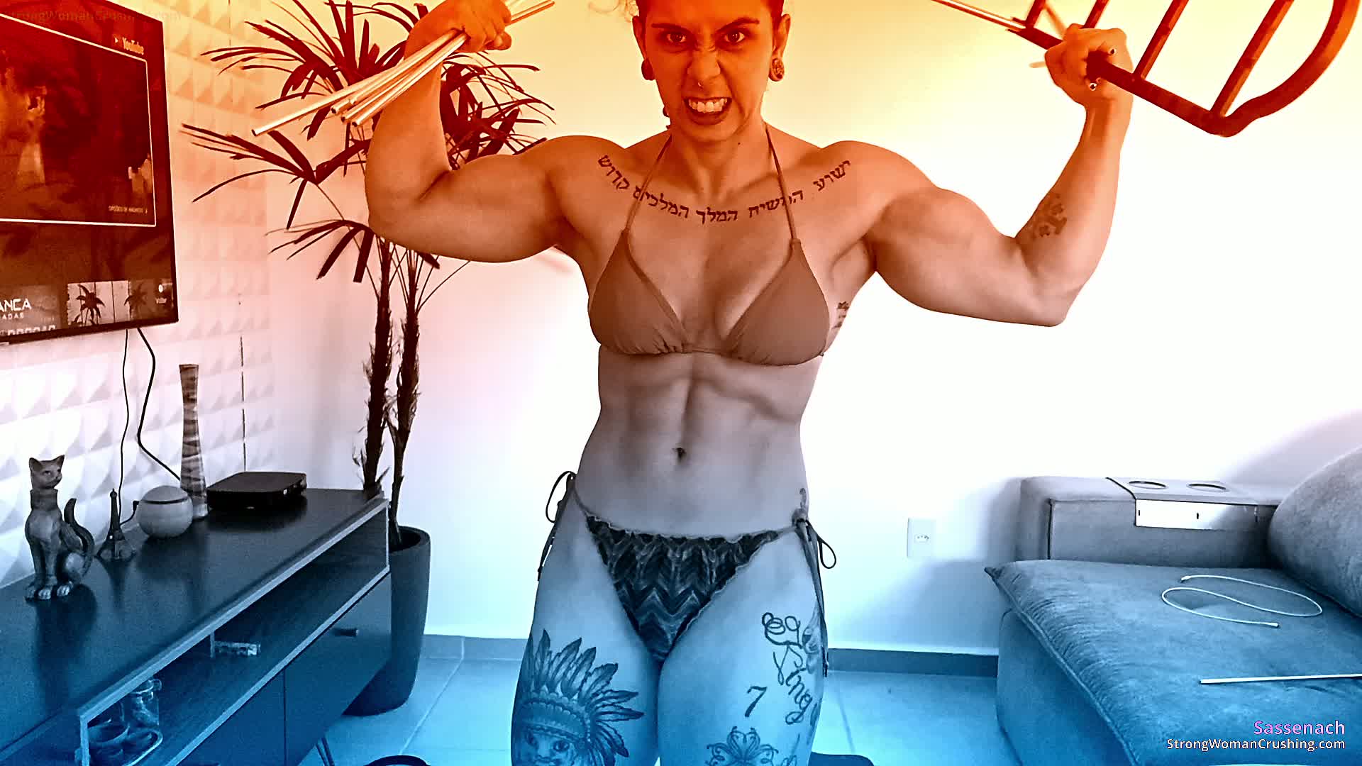 SassenachSassenach uses her power and muscular physique to destroy the shoe rack. She flexes her mountainous biceps and pumps her pecs before the show. She grabs it while bending some metal, also breaking lots of those stupid plastic pieces.