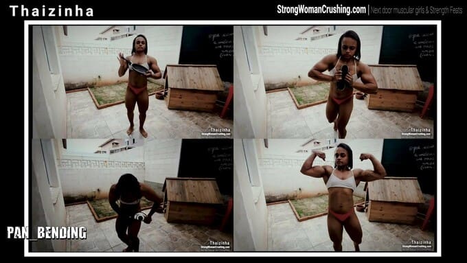 thaizinhaThaizinha uses her mighty muscles for destruction again. Now her victim is a poor metal pan. Watch this insanely powerful female smashes all that metal while she pumps her physique.