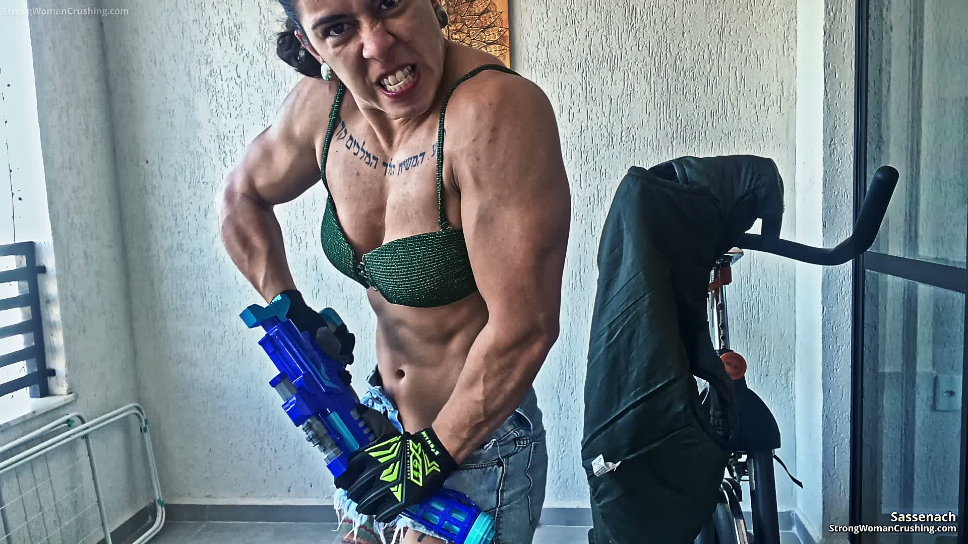 Sassenach uses her strong and muscular arms and destroys a toy gun leaving only pieces behind. Imagine a powerful woman crushing everything with her power. Sas…